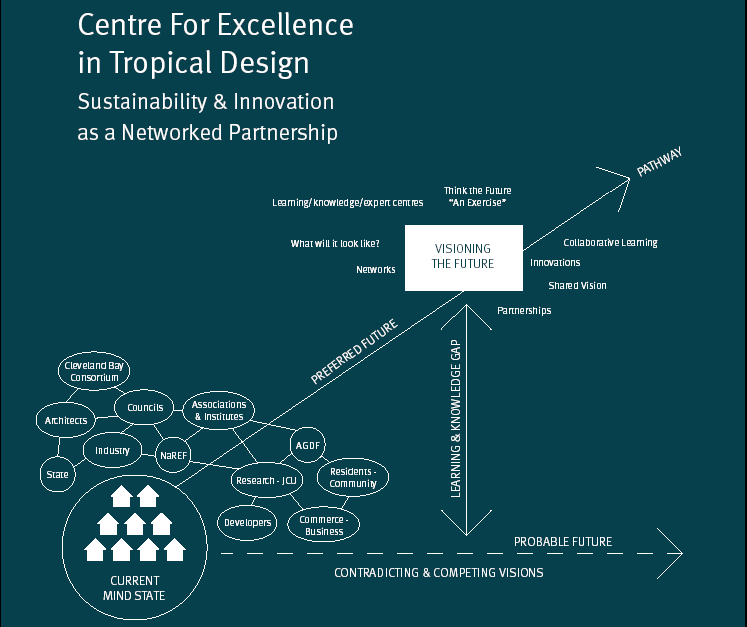 CETD Knowledge Network Cluster Concept - diagram showing relationship between our probable future from current mindset in contrast to creating a prefered future through development of a "learning community/city" via networks, partnerships, innovation and sustainability.